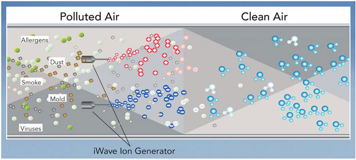 iWave is an air purifying device that installs in any duct air conditioning system. When air passes over the iWave, ions produced by the device reduce pathogens, allergens, particles, smoke, and odors in the air, creating a healthy environment without producing any harmful byproducts.